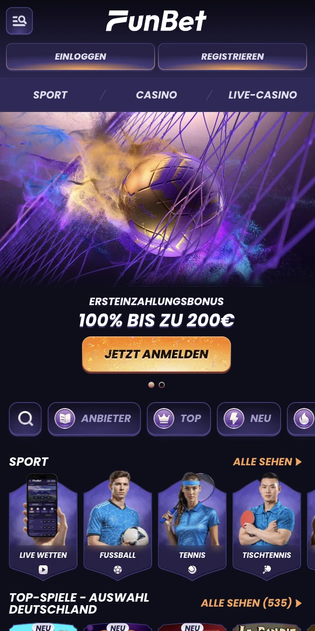 Ja, die komplette Bibliothek ist mobil verfĂĽgbar, sodass du bei Funbet Casino dieselben Titel spielen kannst wie am Desktop. Wenn du download Funbet app suchst, beachte bitte: Wir bieten keine native iOS- oder Android-App an; die offizielle Option ist Browser-Spiel mit einem Home-Screen-Shortcut, der wie eine Funbet app funktioniert. Unsere Willkommensangebote funktionieren ebenfalls mobil, sodass dein Funbet bonus vom Handy aus beansprucht werden kann, solange du die Regeln fĂĽr Mindesteinzahlung und Umsatzbedingungen erfĂĽllst.